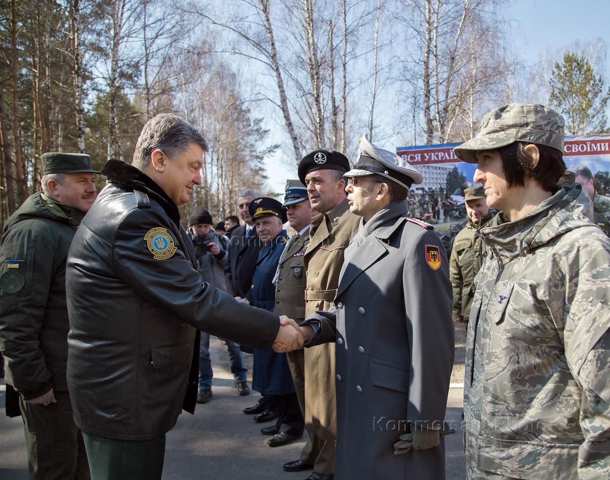 День Национальной гвардии Украины. Мероприятиях по случаю второй годовщины создания Национальной гвардии Украины (НГУ) прошли в учебном центре НГУ в селе Новые Петровцы. Президент Украины Петр Порошенко (второй слева) во время посещения учебного центра НГУ.