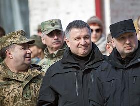 День Национальной гвардии Украины. Мероприятиях по случаю второй годовщины создания Национальной гвардии Украины (НГУ) прошли в учебном центре НГУ в селе Новые Петровцы. Справа налево: министр внутренних дел Украины Арсен Аваков, секретарь Совета национальной безопасности и обороны Украины Александр Турчинов и президент Украины Петр Порошенко во время посещения учебного центра НГУ.