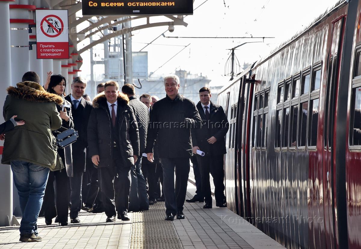 Президент компании ОАО "РЖД" Олег Белозеров (слева), министр транспорта России Максим Соколов (в центре) и мэр Москвы Сергей Собянин (справа) во время осмотра инфраструктуры станции "Шелепиха" Малого кольца Московской железной дороги.