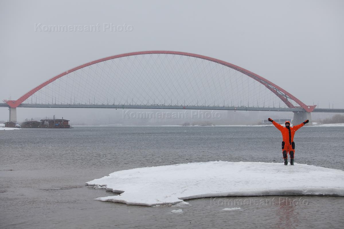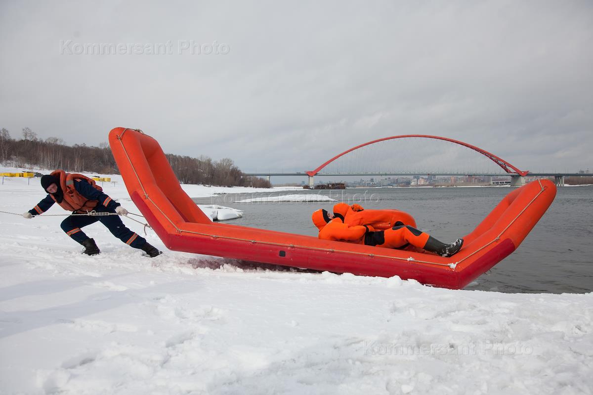 Сотрудники муниципальной аварийно-спасательной службы во время тренировки по спасению рыбаков на льду.