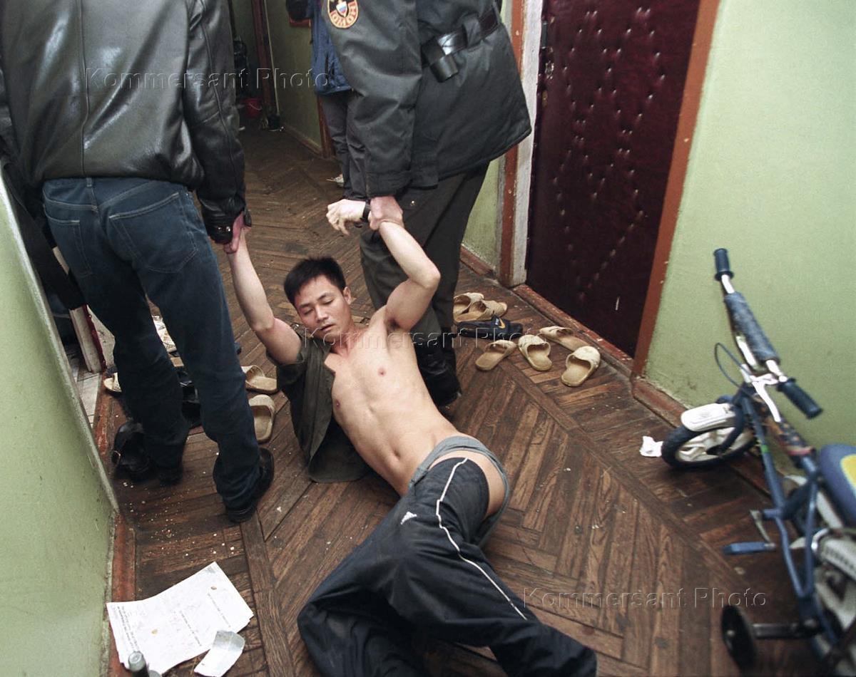Рейд московской милиции по выявлению нелегального проживания граждан Вьетнама. Рейд состоялся во вьетнамском общежитии на Огородном проезде. Милиционеры тащат по коридору вьетнамца.