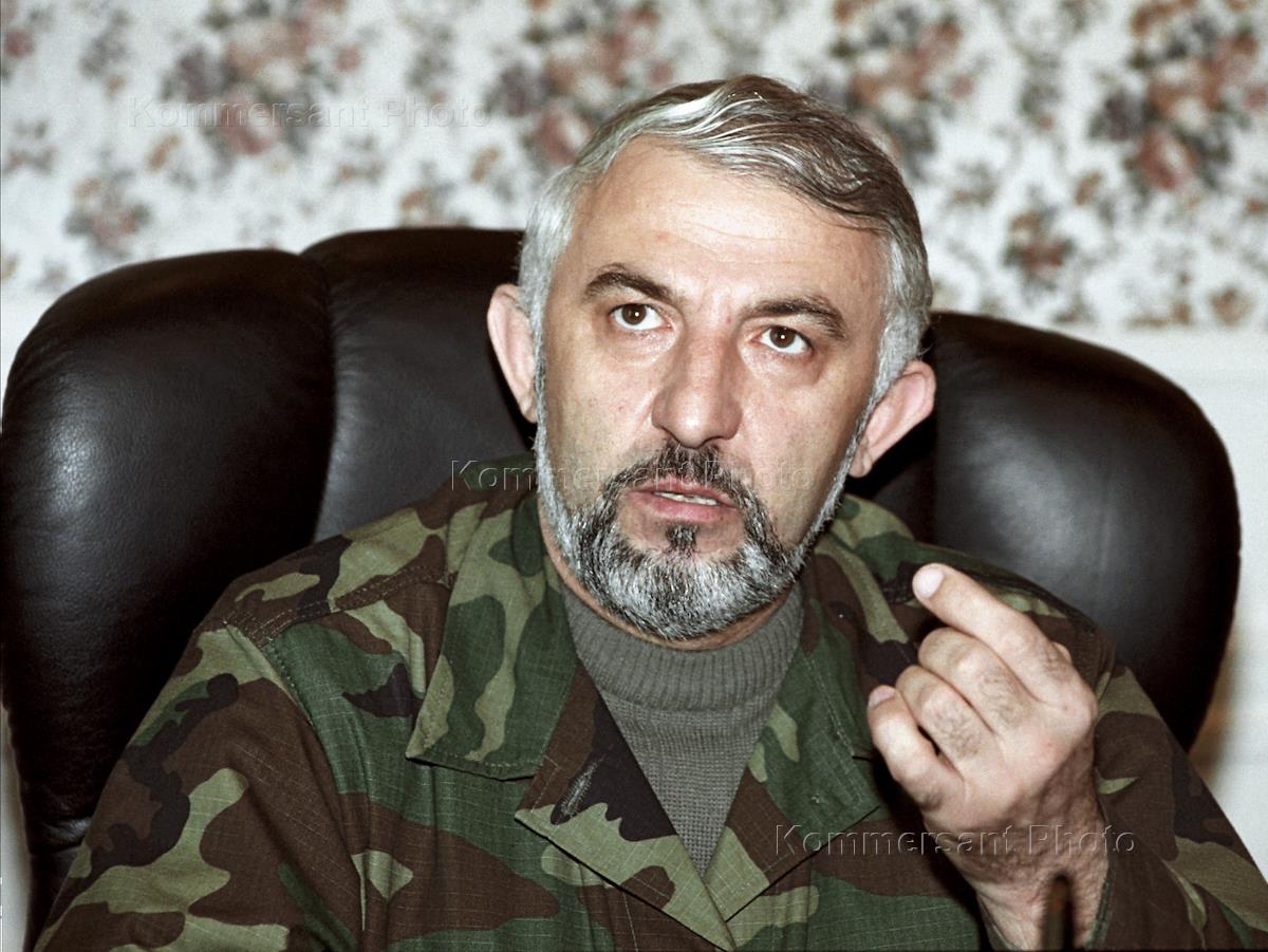 Президент Чеченской республики Аслан Масхадов (слева) и полевой командир Шамиль Басаев (в центре) на улице города.
