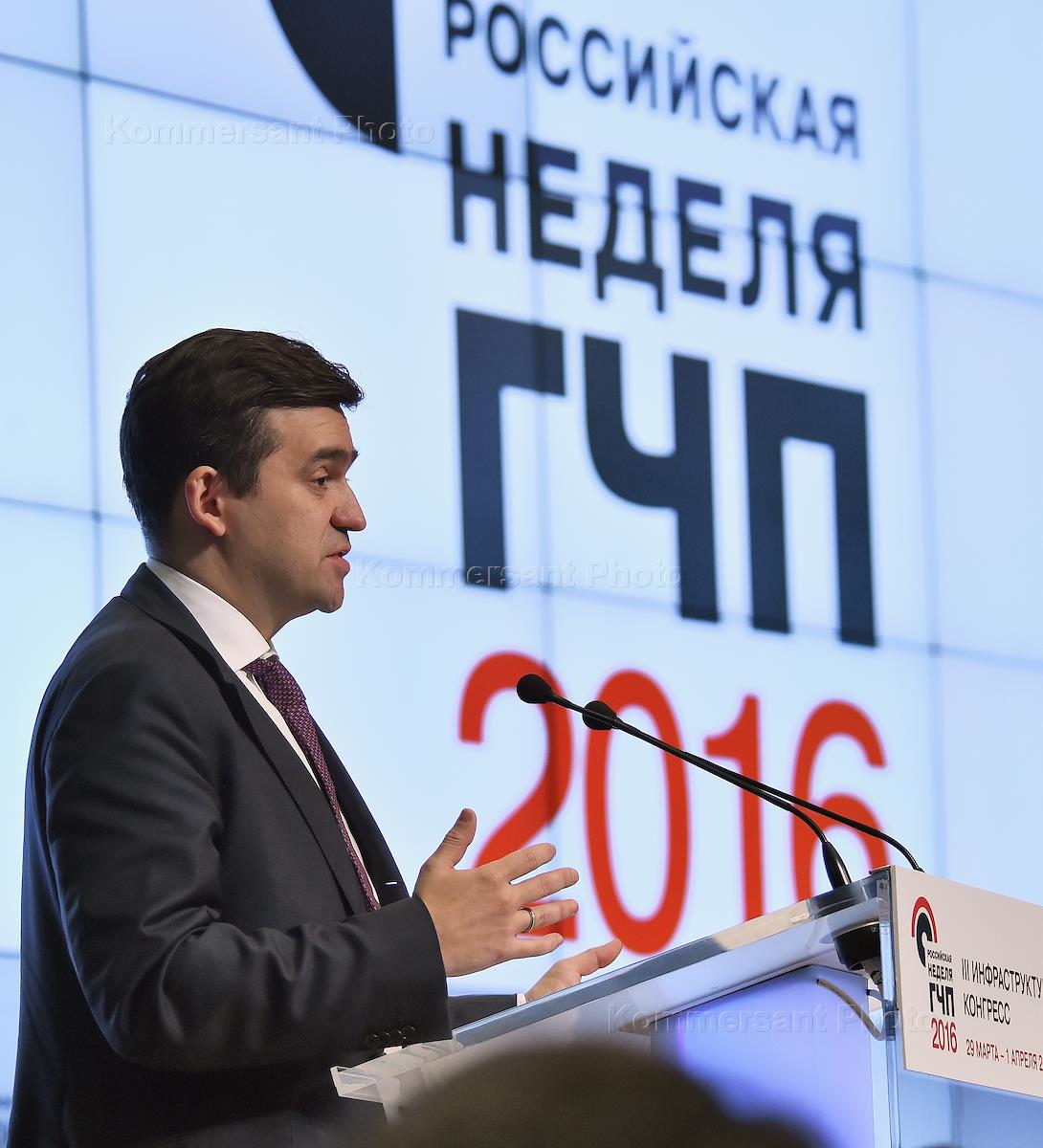 Третий инфраструктурный конгресс "Российская неделя государственно-частного партнерства (ГЧП)" прошел в МИА "Россия сегодня". Заместитель министра строительства и ЖКХ России Андрей Чибис во время конгресса.