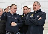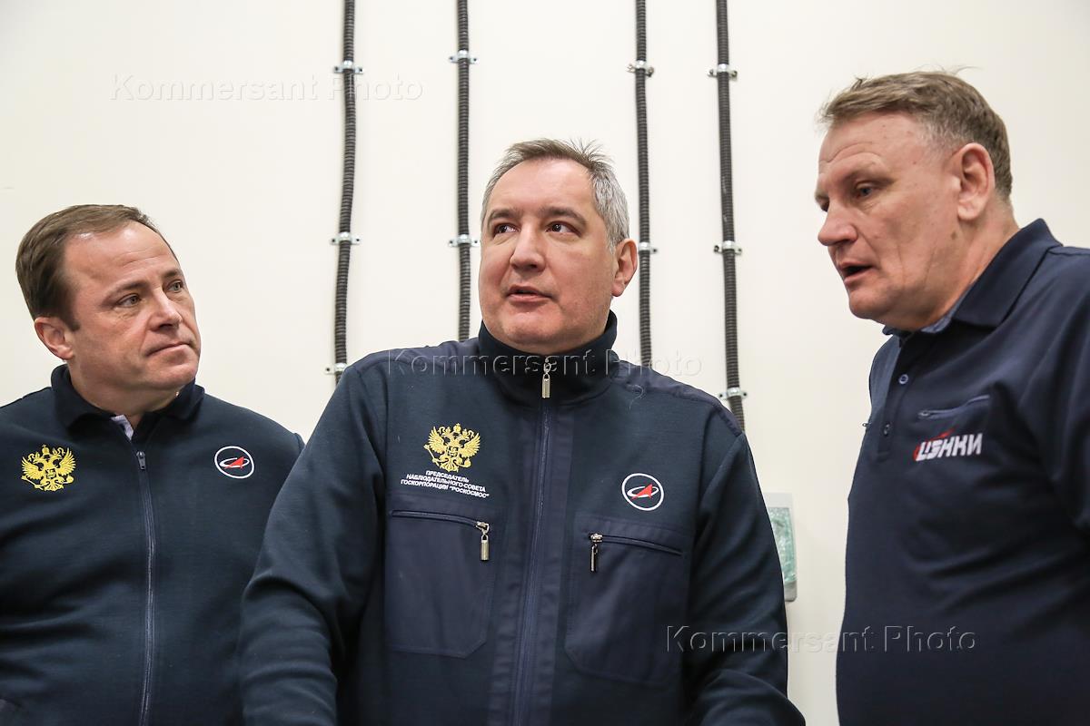 Слева направо: заместитель генерального директора ФГУП "Центр эксплуатации объектов наземной космической инфраструктуры" (ЦЭНКИ) Андрей Охлопков, генеральный директор государственной корпорации "Роскосмос" Игорь Комаров и заместитель председателя правительства Дмитрий Рогозин на космодроме "Восточный".