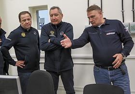 Заместитель председателя правительства Дмитрий Рогозин (слева) и заместитель генерального директора ФГУП "Центр эксплуатации объектов наземной космической инфраструктуры" (ЦЭНКИ) Андрей Охлопков (справа) на космодроме "Восточный".