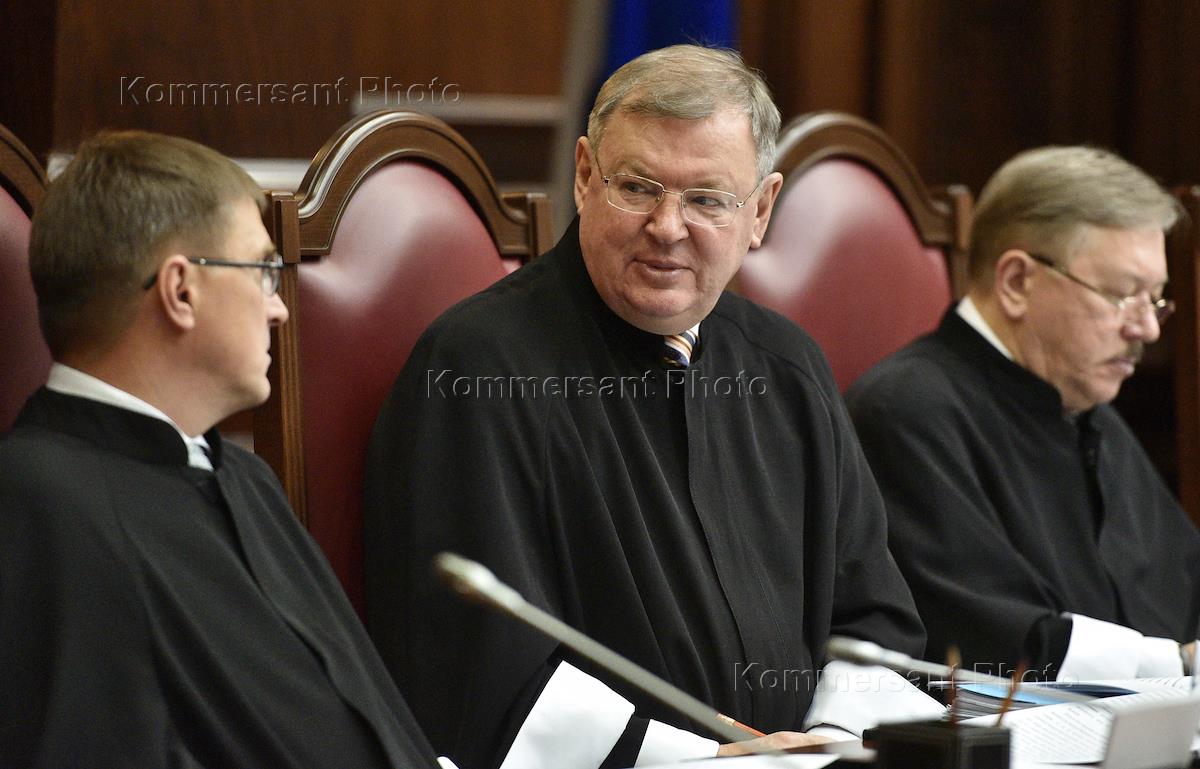 Судья Конституционного суда (КС) России Сергей Князев (в центре) во время открытого заседания КС России по рассмотрению дела о возможности исполнения постановления Европейского суда по правам человека (ЕСПЧ) от 4 июля 2013 года "Анчугов и Гладков против России" по запросу Министерства юстиции России.