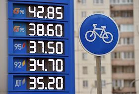 Жанровая фотография. Информационный стенд автозаправочной станции (АЗС) с ценами на разные марки горючего и дорожный знак "Велодорожка" на столбе.