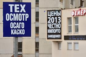 Жанровая фотография. Вывеска с надписью "Техосмотр, ОСАГО, КАСКО" на столбе. Объявление на фасаде здания "Цены 2013 честно! Импортозамещение".