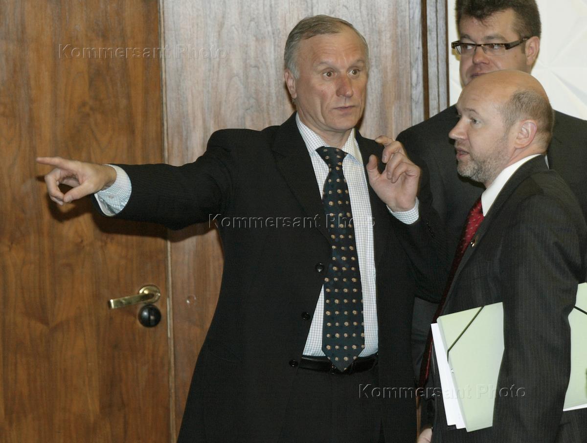 Representative at the Federation Council from the Administration of Novgorod region Gennady Burbulis (left), head of the Federation Council Industrial Policy committee Valentin Zavadnikov and chairman of Moscow Municipal Duma Vladimir Platonov attend the conference.