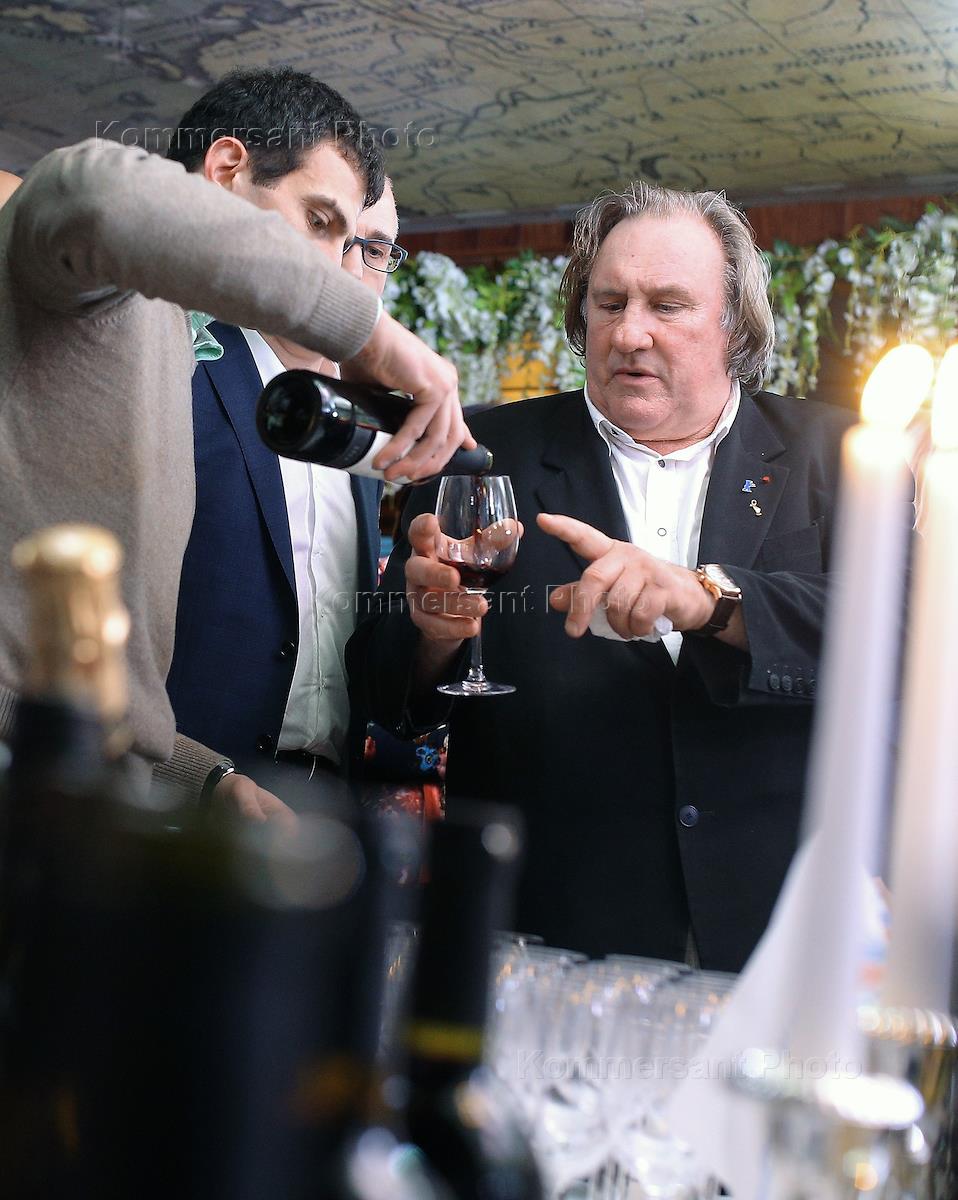 Сопредседатель общероссийской общественной организации "Деловая Россия" Андрей Назаров и Французский актер, режиссер Жерар Депардье дегутстируют вина в ресторане "Ласточка"