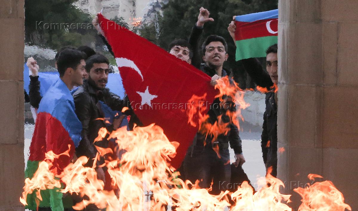 Ситуация в Нагорном Карабахе. Молодые люди с государственным флагом Азербайджана в Баку.