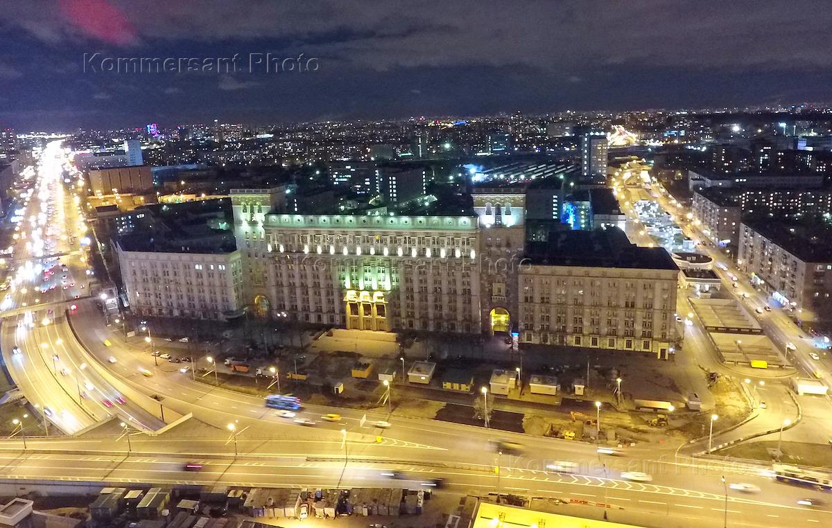 Виды вечерней Москвы. Здание Гидропроекта на пересечении Волоколамского и Ленинградского шоссе. ПАО "НПО "Алмаз" имени академика А.А. Расплетина".