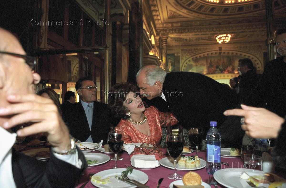 Italian actress Jina Lollobrigida (center) and head of Russian Filmmaker's Union Nikita Mikhalkov (right) attend "Russkoe radio" party during the XXV MIFF at "Yar" restaurant.