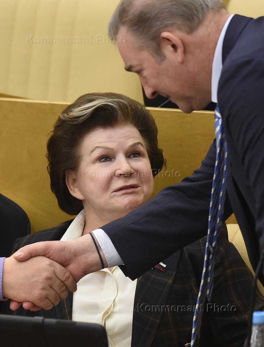 Член комитета Государственной думы (ГД) России по земельным отношениям и строительству Олег Валенчук (слева) и заместитель председателя комитета ГД России по международным делам Валентина Терешкова (справа) во время пленарного думского заседания.