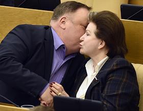 Член комитета Государственной думы (ГД) России по земельным отношениям и строительству Олег Валенчук (слева) и заместитель председателя комитета ГД России по международным делам Валентина Терешкова (справа) во время пленарного думского заседания.