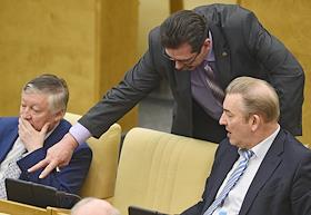 Член комитета Государственной думы России по обороне Сергей Попов (в центре) во время пленарного думского заседания.