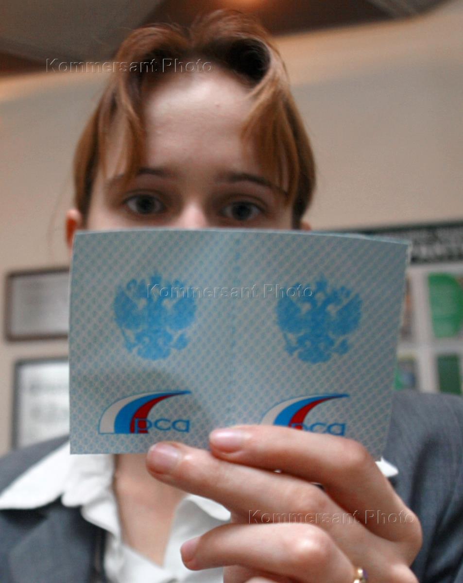An unidentified employee of RESO insurance company studies a certificate of comprehensive automotive insurance, introduced in Russia by the federal parliament on July 1, 2004.