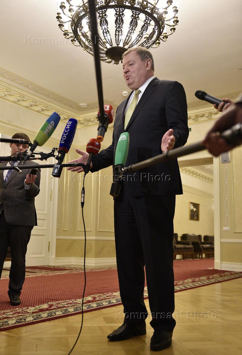 Заседания Конституционного суда России по делу о возможности исполнения постановления Европейского суда по правам человека от 4 июля 2013 года "Анчугов и Гладков против России". Председатель Конституционного суда России Валерий Зорькин (слева) и его заместитель Сергей Маврин (в центре) после заседания.