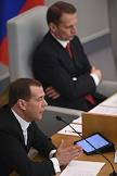 Пленарное заседание Государственной думы России, в рамках которого председатель правительства России Дмитрий Медведев отчитался о работе правительства в 2015 году. Председатель правительства России Дмитрий Медведев (в центре) и председатель Государственной думы России Сергей Нарышкин (слева) во время заседания.