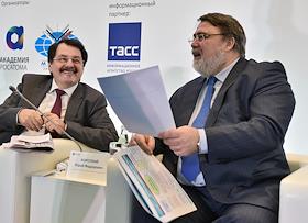 Всероссийский форум "Гособоронзаказ-2016: реформа:". Первый заместитель председателя комитета Государственной думы России по обороне Сергей Жигарев (слева) и вице-губернатор Московской области Ильдар Габдрахманов (справа) во время форума в Доме правительства Московской области.