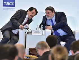 Всероссийский форум "Гособоронзаказ-2016: реформа:". Первый заместитель руководителя Федеральной службы по финансовому мониторингу (Росфинмониторинг) Юрий Короткий (слева) и рукововдитель Федеральной антимонопольной службы (ФАС) России Игорь Артемьев (справа) во время форума в Доме правительства Московской области.