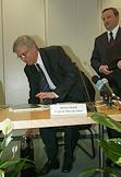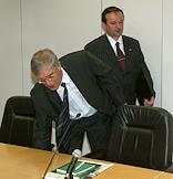 Chairman of the Central Bank of Russia Sergey Ignatiev (left) and director of Sberbank of Russia Andrey Kazmin (right) attend the annual general Sberbank shareholders' meeting.
