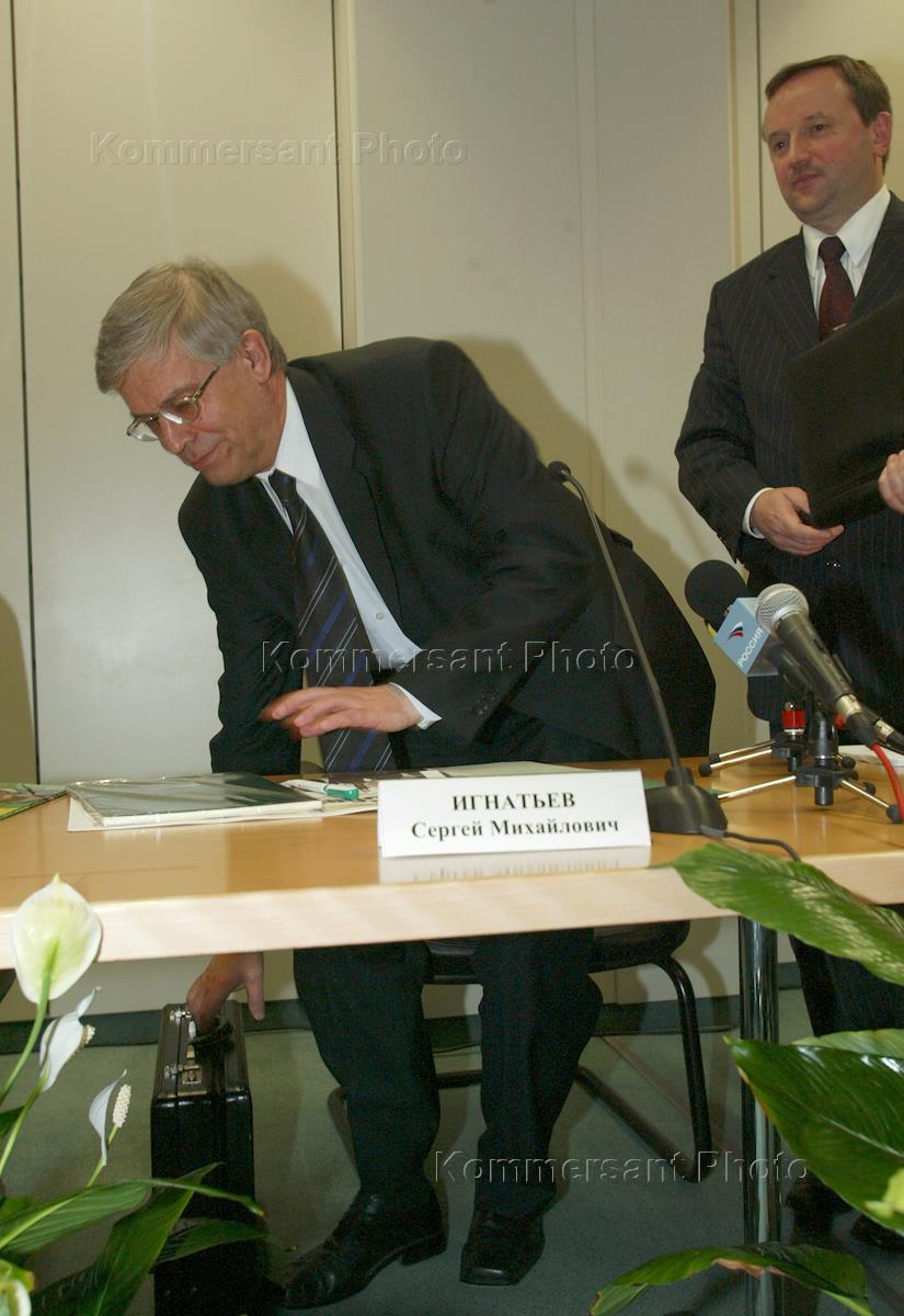 Председатель Центрального Банка России Сергей Игнатьев (слева) и председатель правления Сбербанка России Андрей Казьмин (справа) во время годового общего собрания акционеров Сбербанка.