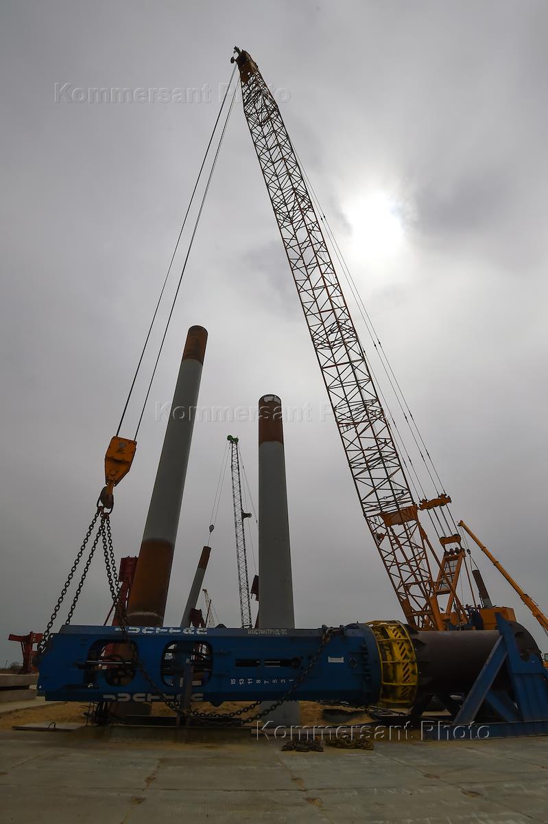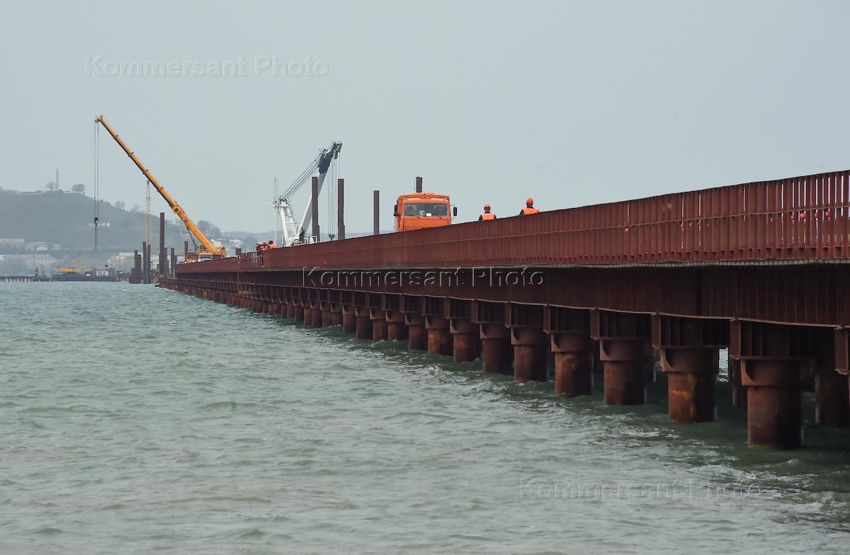 Строительство моста через Керченский пролив. Сварщики во время работы.
