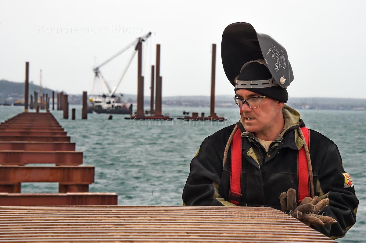 Строительство моста через Керченский пролив. Сварщик во время работы.