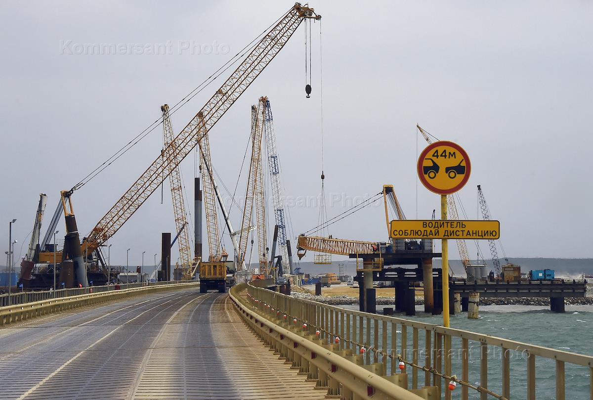 Workers are building bridge across the Kerch Strait.