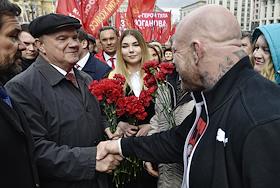 Церемония возложения цветов к Мавзолею на Красной площади, в 146-ю годовщину со дня рождения Владимира Ленина. Лидер КПРФ, член комитета Государственной думы (ГД) России по науке и наукоемким технологиям Геннадий Зюганов (второй слева), российская спортсменка в пауэрлифтинге Марьяна Наумова (вцентре) и борец по смешанным боевым искусствам Джеффри Монсон (справа) во время церемонии, организованной Коммунистической партией России (КПРФ).