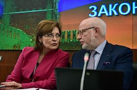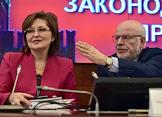Специальное заседание Совета при президенте России по развитию гражданского общества и правам человека (СПЧ) по теме "Переселение соотечественников в Россию: проблемы законодательства и практики" прошло в здании Администрации президента России. Начальник главного управления по вопросам миграции МВД России Ольга Кириллова (слева) и председатель Совета при президенте России по развитию гражданского общества и правам человека Михаил Федотов (справа) во время заседания.