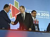 Рабочая поездка президента России Владимира Путина в Казань. Президент Международной федерации дзюдо (IJF) Мариус Визер, президент России Владимир Путин и российский спортсмен Арсен Галстян на церемонии открытии чемпионата Европы по дзюдо 2016 года на территории многофункционального спортивно-концертного комплекса "Татнефть-Арена".