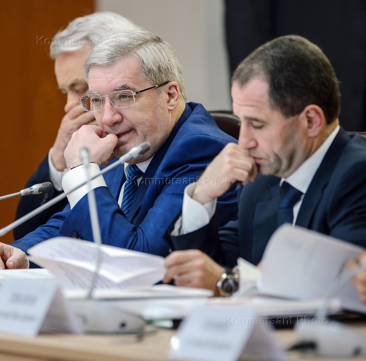 Рабочая поездка президента России Владимира Путина в Казань. Губернатор Красноярского края Виктро Толоконский (в центре) и полномочный представитель президента России в Приволжском Федеральном округе Михаил Бабич (справа) во время заседания Совета при президенте России по развитию физической культуры и спорта.