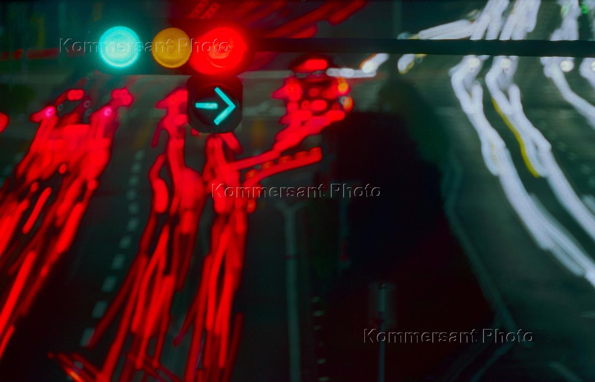 Cars in the streets and traffic lights.