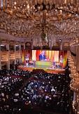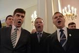 VIII съезд политической партии "Справедливая Россия" в Колонном зале Дома союзов. Члены партии исполняют Гомн партии.