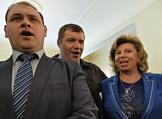 VIII съезд политической партии "Справедливая Россия" в Колонном зале Дома союзов. Лидер партии "Справедливая Россия" Сергей Миронов (слева) и уполномоченный по правам человека в России Татьяна Москалькова (справа) на съезде.