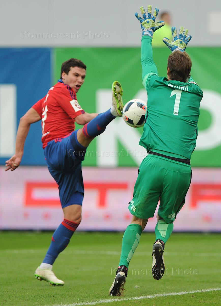 РОСГОССТРАХ - Чемпионат России по футболу 2015/2016. 25-й тур. Матч между командами ЦСКА (Москва) и "Динамо" (Москва) прошел на стадионе "Арена Химки". Вратарь ФК "Динамо" Антон Шунин (справа) во время матча.