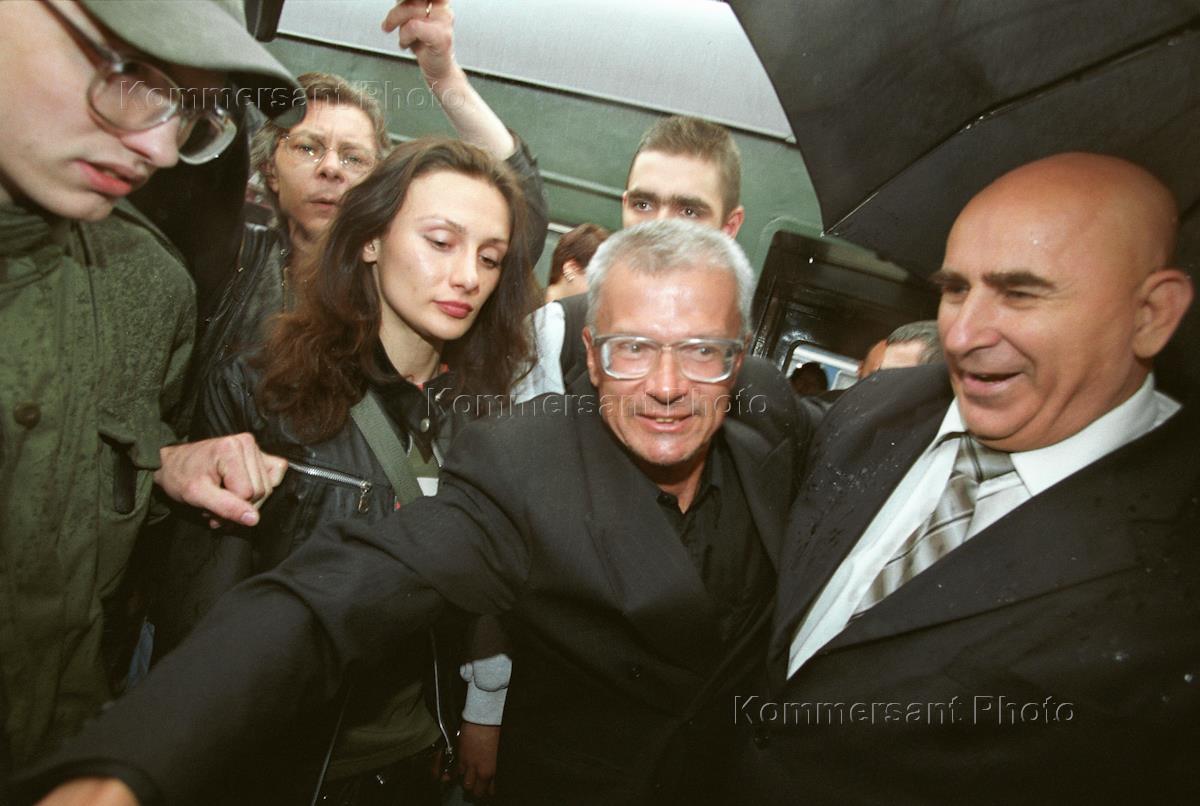 Депутат Государственной Думы России, член фракции КПРФ Василий Шандыбин (справа) во время встречи писателя и лидера национал-большевиков Эдуарда Лимонова (в центре) на Павелецком вокзале. Лимонов вернулся в Москву из заключения в Саратовской тюрьме, где отбывал срок за хранение и транспортировку оружия.