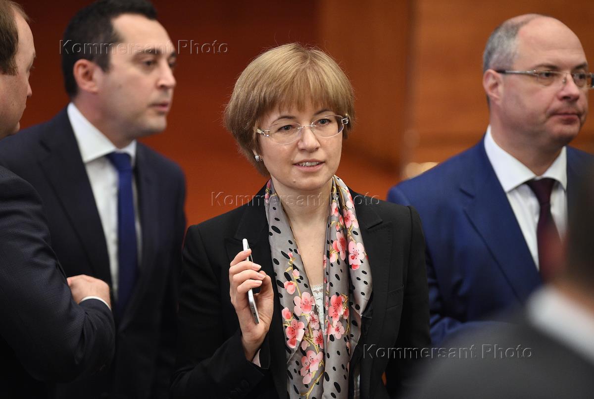 Первый заместитель председателя Центрального Банка России Ксения Юдаева (в центре) и председатель комитета Государственной думы России по вопросам собственности Сергей Гаврилов (справа) на расширенном заседании коллегии Министерства экономического развития России.
