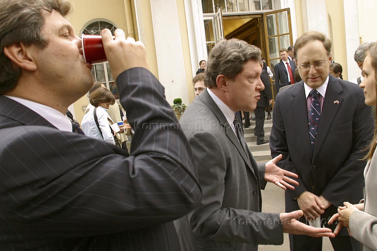 Руководитель фракции "Яблоко" Григорий Явлинский (слева) и посол США в России Александр Вершбоу (справа) на праздновании Дня Независимости США в Американском Посольстве.