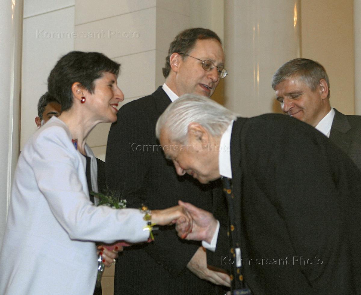 Посол США в России Александр Вершбоу (второй справа) и его супруга, профессиональный художник-ювелир Лиза Вершбоу (слева) и художественный руководитель театра "На Таганке" Юрий Любимов (в центре) на праздновании Дня Независимости США в Американском Посольстве.