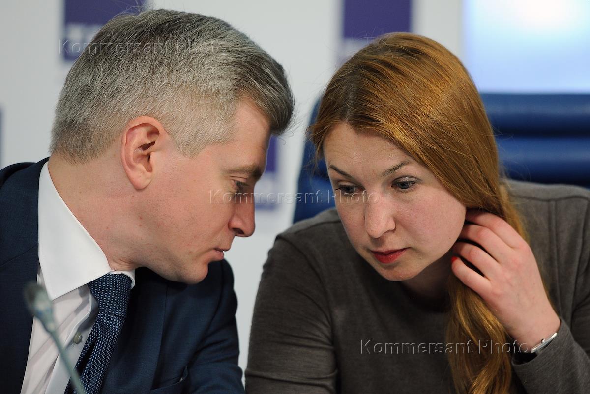 Директор Мосгорпарка Марина Люльчук (слева) и руководитель Департамента культурного наследия города Москвы Александр Кибовский (справа) на пресс-конференции, посвященной готовности московских парков к началу летнего сезона. Пресс-конференция прошла в ТАСС.