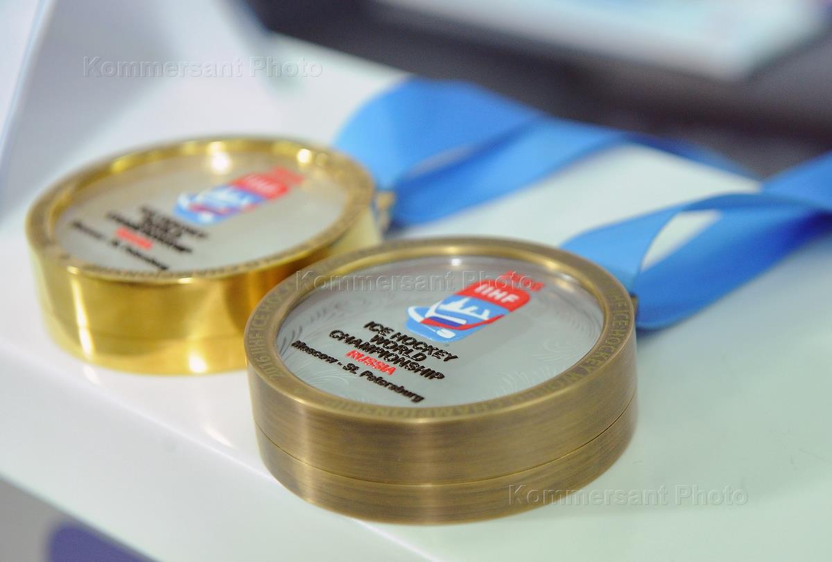 Медали, представленные на пресс-конференции, посвященной чемпионату мира по хоккею с шайбой – 2016. Пресс-конференция прошла в пресс-центре ТАСС.