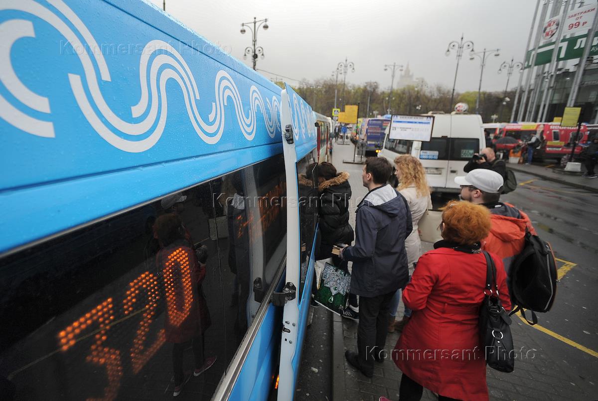 Пресс-тур, посвященный масштабной реформе наземного общественного транспорта в мае - июне 2016 года. Пассажиры во время посадки в муниципальное маршрутное такси.