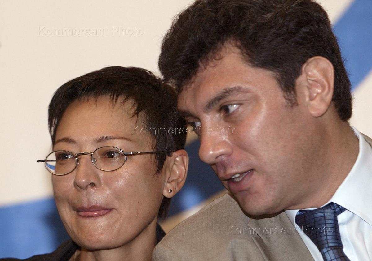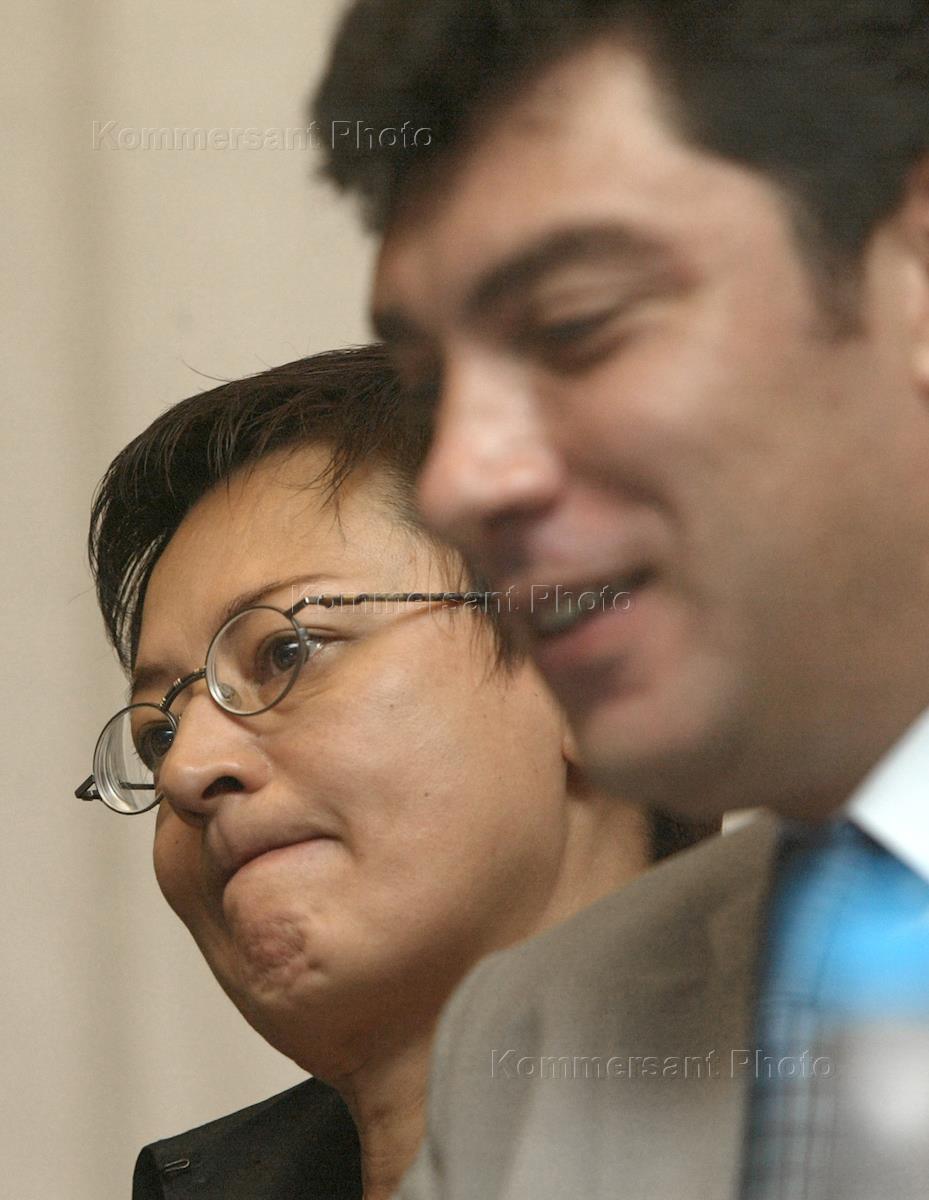 Заместитель руководителя фракции "Союз Правых Сил" (СПС), заместитель председателя Государственной Думы России Ирина Хакамада (слева) и лидер Союза правых сил (СПС), депутат Государственной Думы России Борис Немцов (справа) на заседании Форума правой молодежи, организованного при поддержке партии СПС. Форум прошел Киноконцертном комплексе гостиницы "Измайлово".