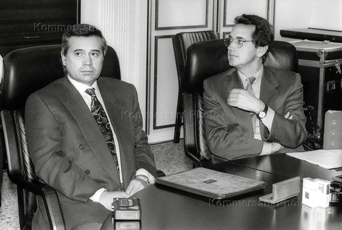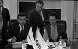 Церемония подписания договора нефтяной компании "Лукойл" и итальянским энергетическим концерном ENI. Президент "ЛУКойл" Вагит Алекперов (в центре) и генеральный менеджер ENI Франко Бернабе (справа) во время церемонии.