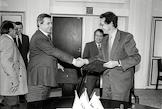 Церемония подписания договора нефтяной компании "Лукойл" и итальянским энергетическим концерном ENI. Президент "ЛУКойл" Вагит Алекперов (второй слева) и генеральный менеджер ENI Франко Бернабе (справа) во время церемонии.