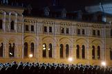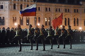 Ночная совместная репетиция пешей и механизированной колонн парадного расчета по подготовке к военному параду, посвященного 71-й годовщине Победы в Великой Отечественной войне, на Красной площади. Проход знаменной группы с Государственным Флагом России и Знаменем Победы.