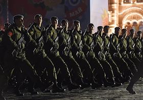 Ночная совместная репетиция пешей и механизированной колонн парадного расчета по подготовке к военному параду, посвященного 71-й годовщине Победы в Великой Отечественной войне, на Красной площади. Колонна военнослужащих Воздушно-десантных войск (ВДВ) ВС России.